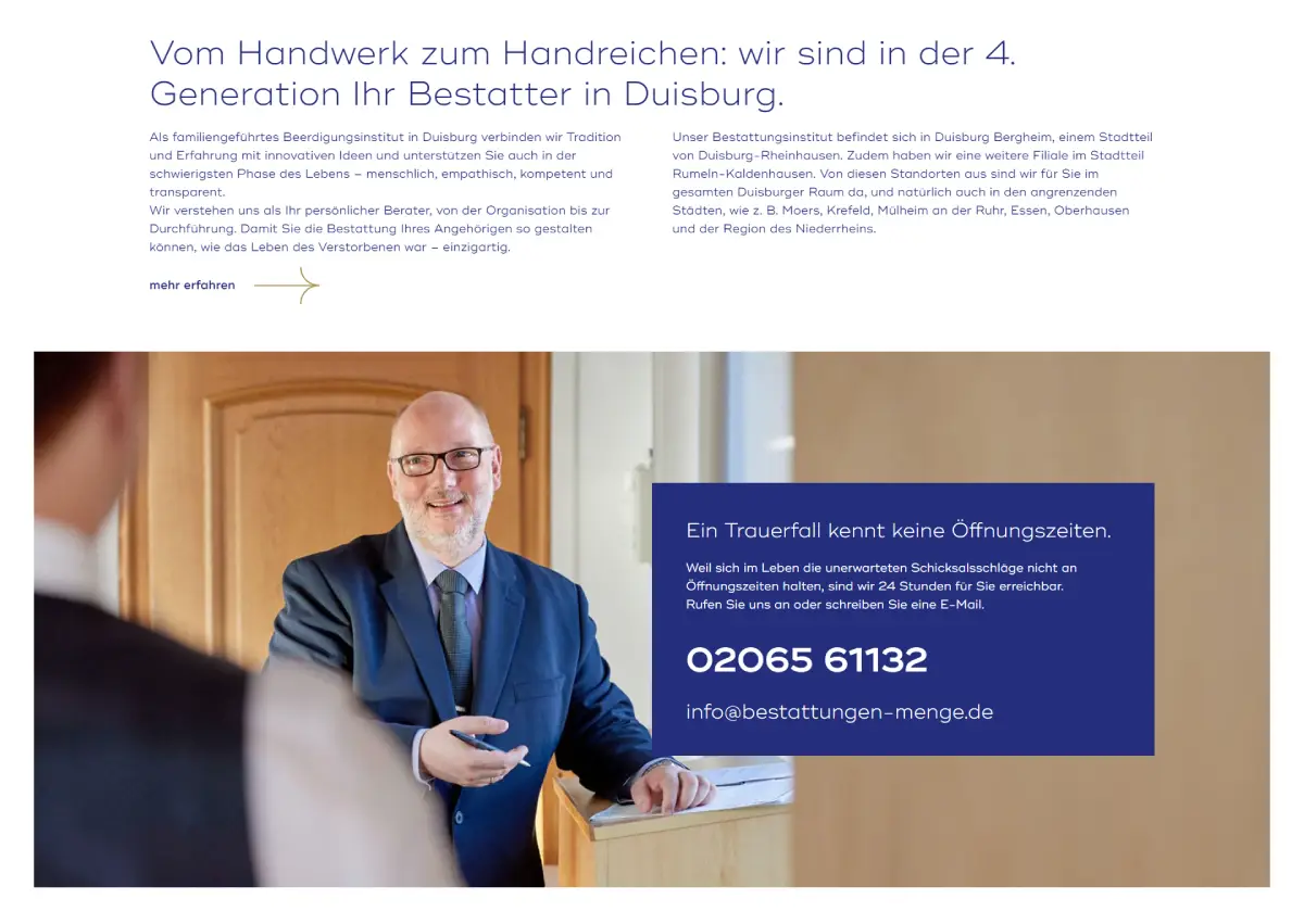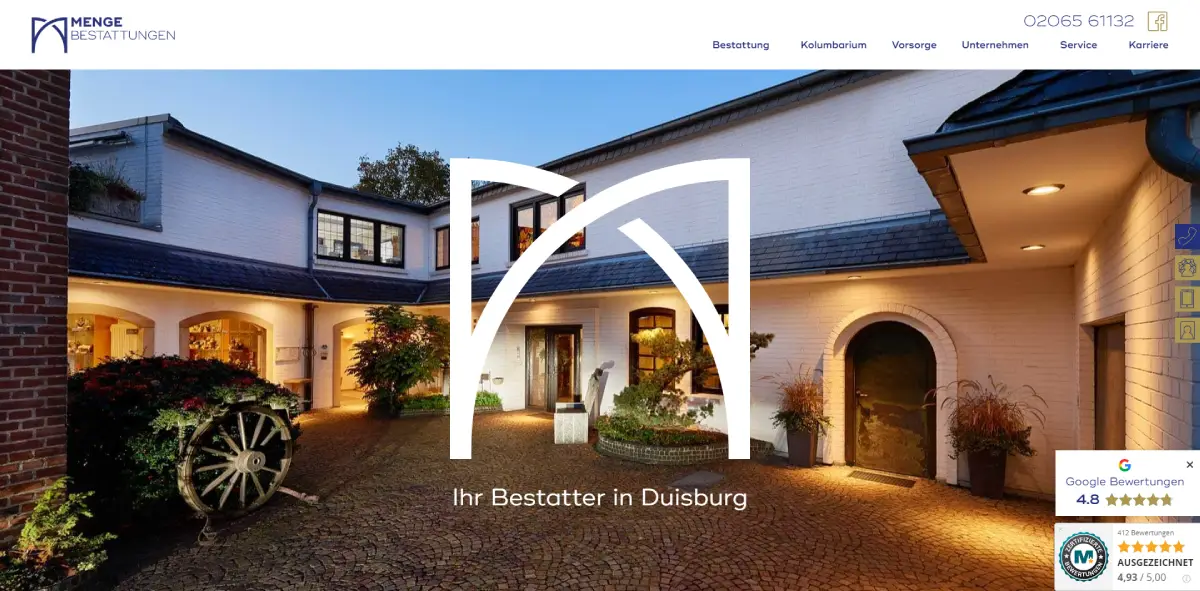 Bestattungen Menge GmbH steht für würdevolle und persönliche Bestattungsdienstleistungen in Duisburg und Umgebung. In Zusammenarbeit mit der Agentur Oppafranz aus Duisburg hat MediaBees eine ansprechende Webpräsenz entwickelt, die die Tradition des Unternehmens mit modernen digitalen Lösungen vereint. Die Website, realisiert mit WordPress und Elementor, wurde nicht nur für Menge Bestattungen, sondern auch für fünf weitere Bestattungsunternehmen in Gelsenkirchen erfolgreich umgesetzt.