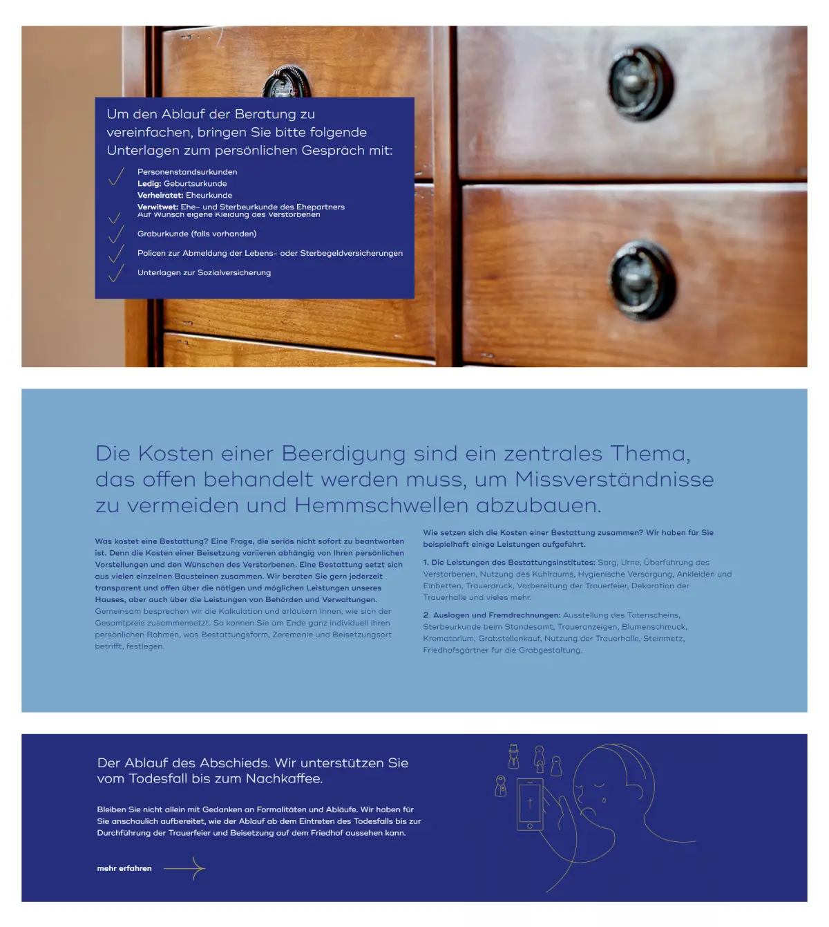 Die klare und respektvolle Gestaltung der Webseiten ermöglicht es den Nutzern, sich umfassend über die Bestattungsoptionen und -dienstleistungen zu informieren. Intuitive Navigation und detaillierte Servicebeschreibungen erleichtern es den Angehörigen, in schwierigen Zeiten passende Entscheidungen zu treffen. Die Webseiten dienen als wichtige Informationsquelle und erste Anlaufstelle für Betroffene, die Unterstützung im Trauerfall suchen.