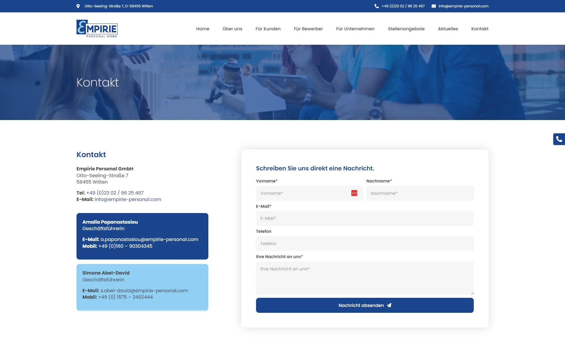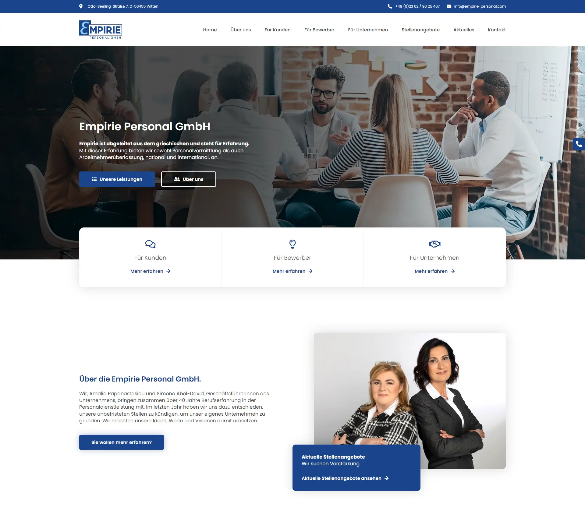 Die visuelle Gestaltung der Webseite harmoniert mit der Corporate Identity von Empirie Personal und bietet ein kohärentes Nutzererlebnis auf allen Endgeräten. Besonderer Wert wurde auf die Optimierung für Mobilgeräte gelegt, um eine optimale Darstellung und Benutzerfreundlichkeit zu gewährleisten.