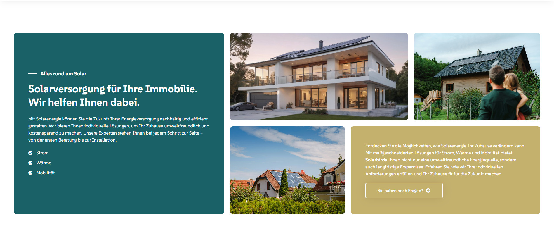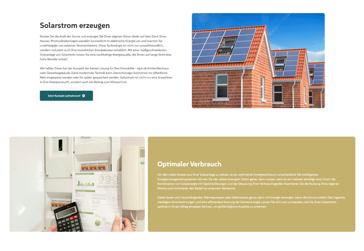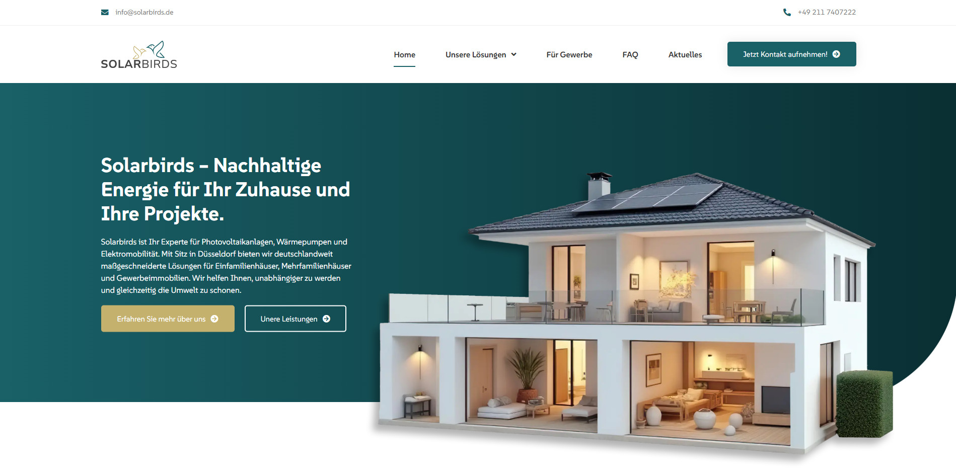 Die Solar Birds GmbH ist ein innovativer Anbieter für nachhaltige Energielösungen, spezialisiert auf Photovoltaik und Solartechnologie. Mit zukunftsweisenden Konzepten und modernster Technik unterstützen sie Unternehmen und Privathaushalte dabei, umweltfreundlichen Strom zu produzieren und unabhängig von fossilen Energieträgern zu werden. Solar Birds kombiniert Expertise mit einer klaren Mission: den Einsatz erneuerbarer Energien voranzutreiben und so einen Beitrag zum Klimaschutz zu leisten. Von der Planung über die Installation bis zur Wartung – Solar Birds steht für ganzheitliche Lösungen und höchste Effizienz.