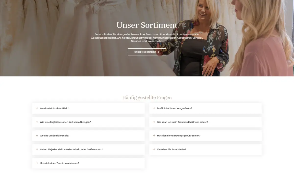 Die Webseite dient als digitales Schaufenster, das die neuesten Trends und Kollektionen in der Brautmode präsentiert. Interessenten können sich umfassend über das Angebot informieren und direkt Kontakt aufnehmen, um persönliche Beratungstermine zu vereinbaren. Das klare Layout und die einfache Navigation machen es den Besuchern leicht, sich zurechtzufinden und die traumhaften Kreationen zu erkunden. Durch die professionelle Umsetzung mit WordPress und Elementor ist White Design Rhein optimal für den digitalen Raum aufgestellt und erreicht effektiv seine Zielgruppe.